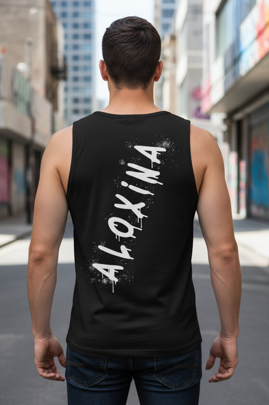 A arte do graffiti na sua regata. O lettering ALOXINA em efeito spray e escorrido para um visual autêntico. Unissex e indispensável