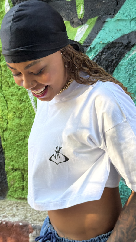 Cropped branco feminino com corte moderno e caimento confortável. Peça versátil que combina estilo urbano e autenticidade, ideal para compor looks cheios de atitude.