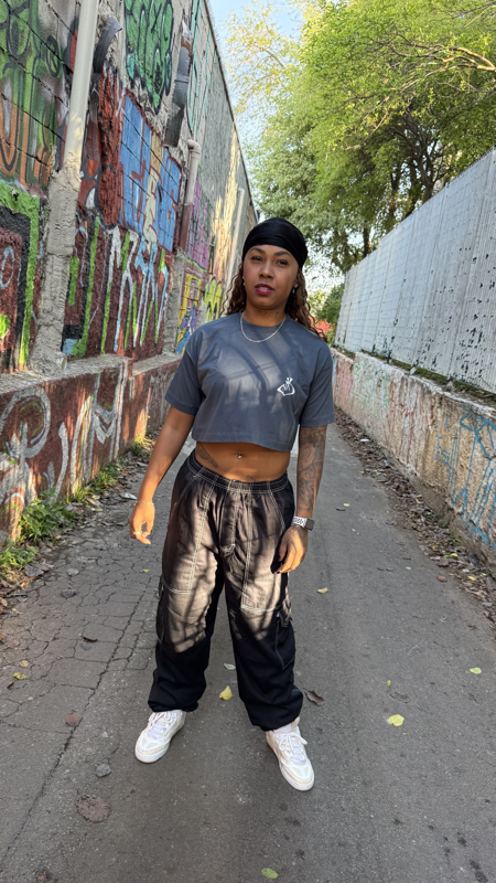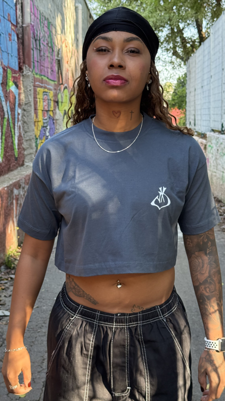 Cropped cinza feminino com corte moderno e caimento confortável. Peça versátil que combina estilo urbano e autenticidade, ideal para compor looks cheios de atitude.